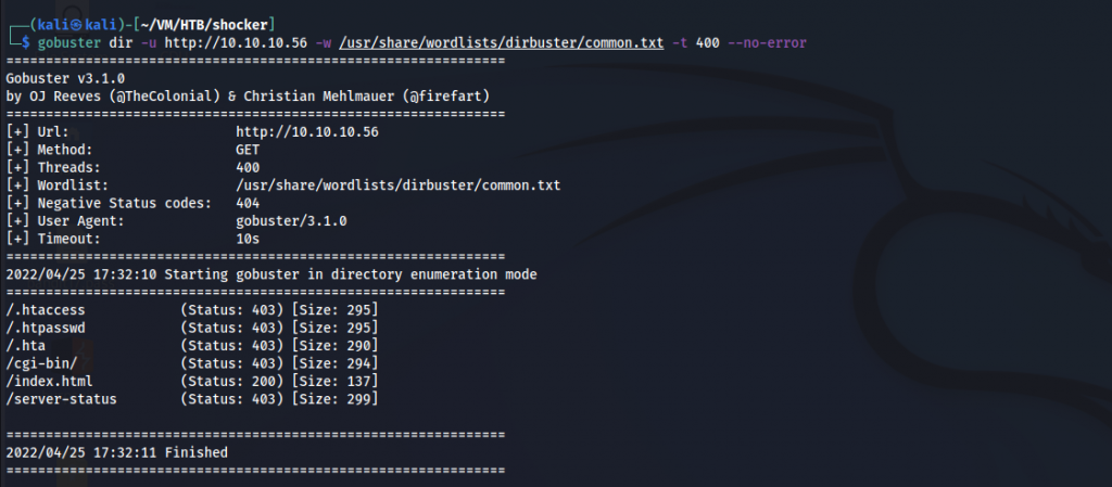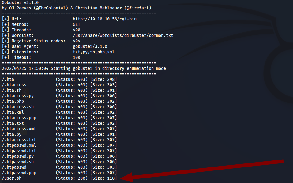 gobuster dir -u http://10.10.10.56/cgi-bin -w /usr/share/wordlists/dirbuster/common.txt -x .php,.xml,.txt,.py,.sh -t 400 --no-error