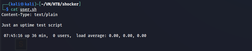 Let’s see the content of the user.sh file. I downloaded the file and after looking at the content, I can see that it is running the uptime command.